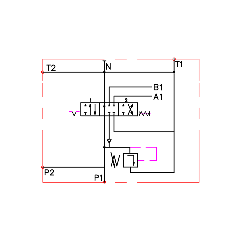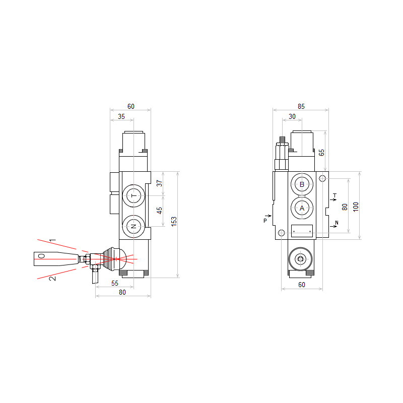 | Hydraulické schéma jezdce: | A (po uvolnění páky do neutrální polohy jezdec odpojí výstupy A a B, což má za následek okamžité zastavení a zablokování přijímače, např. servomotoru nebo hydromotoru) |