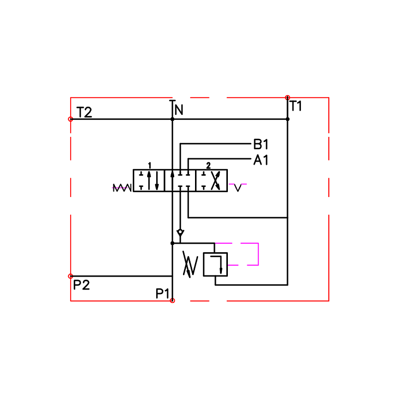| Hydraulické schéma jezdce: | A (po uvolnění páky do neutrální polohy jezdec odpojí výstupy A a B, což má za následek okamžité zastavení a zablokování přijímače, např. servomotoru nebo hydromotoru) |