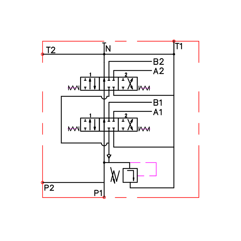 Určeno pro ovládání dvou přijímačů v hydraulickém systému, např. dvou dvojčinných válců nebo dvou motorů v obou směrech. |