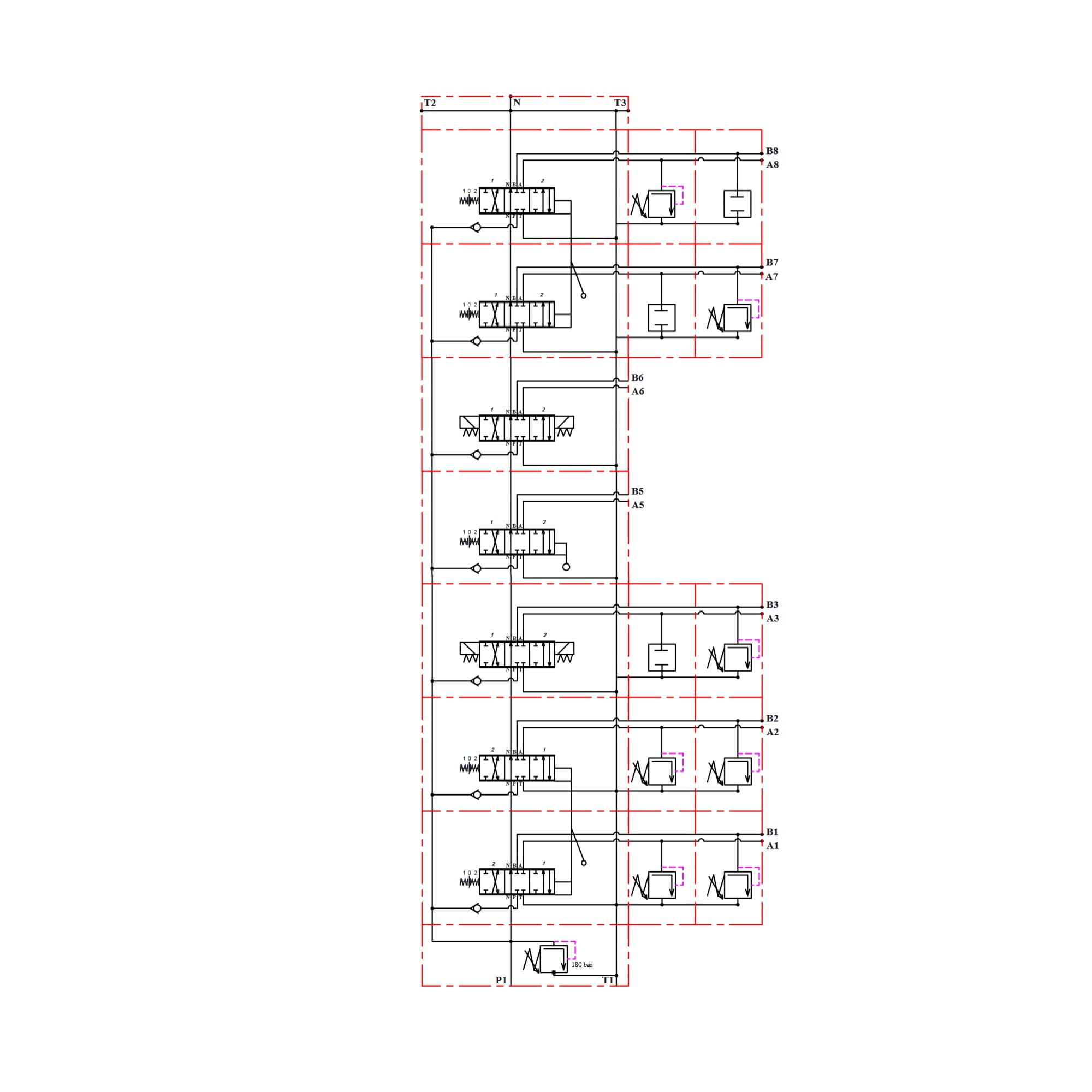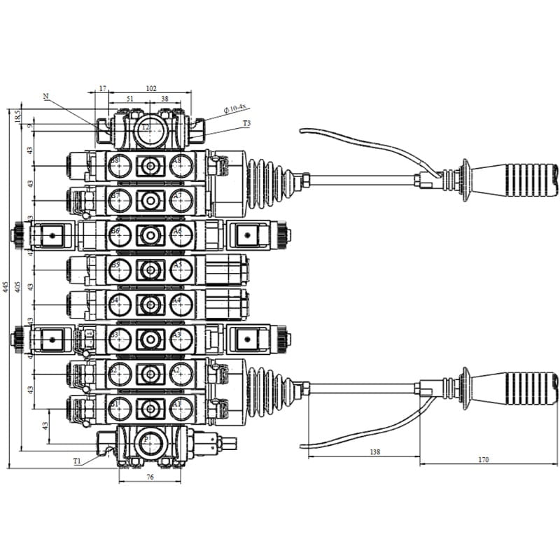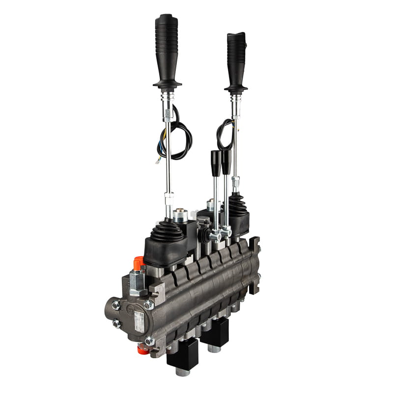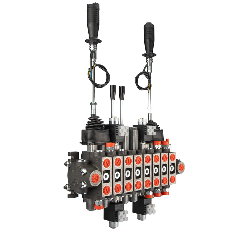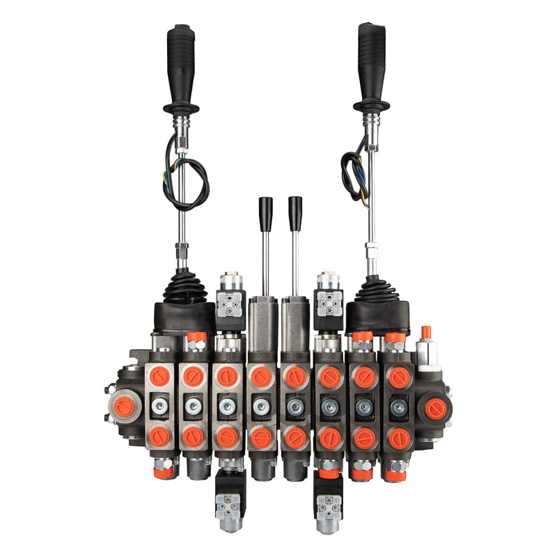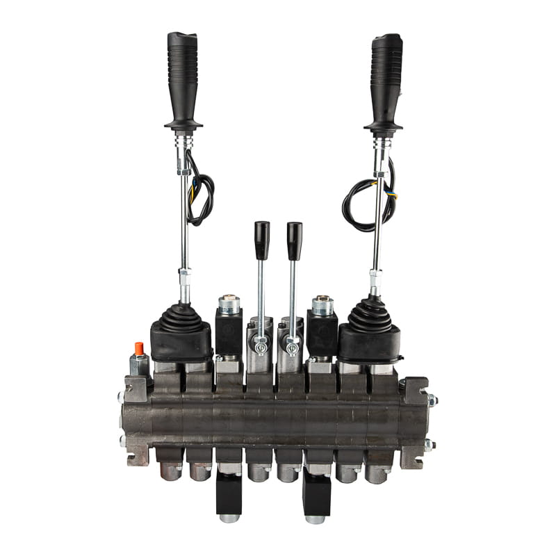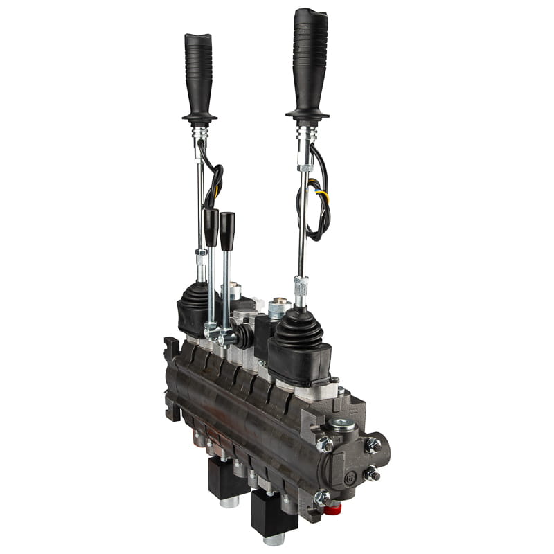 Modulární hydraulický rozdělovač 8sekční. Dvě sekce ovládané pákami, dvě sekce ovládané elektricky