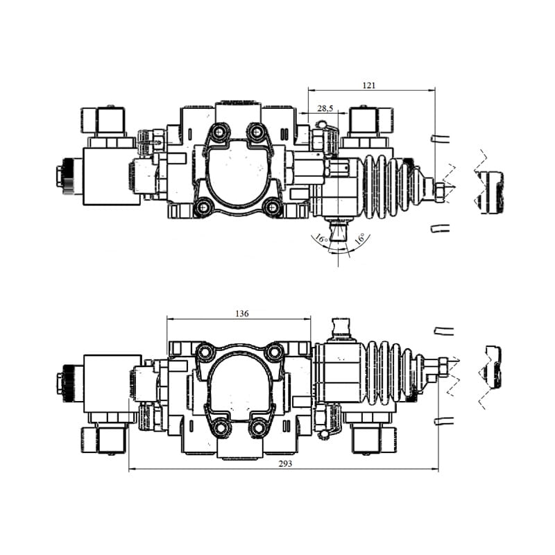 12V DC a čtyři sekce ovládané 2 joysticky. Joysticky mají celkem čtyři elektrická tlačítka (2+2) nestabilní