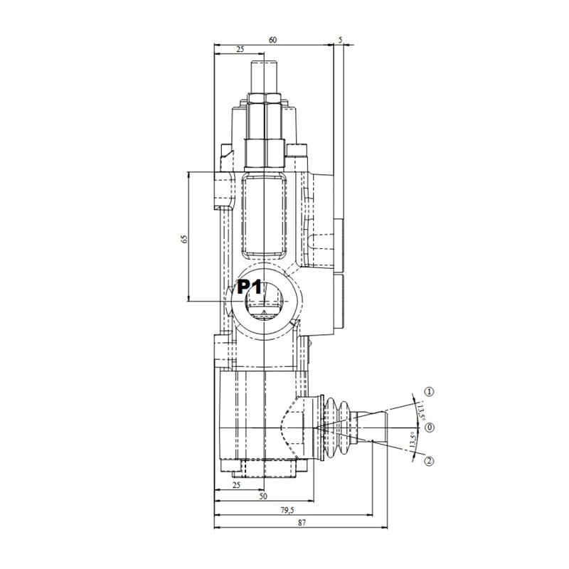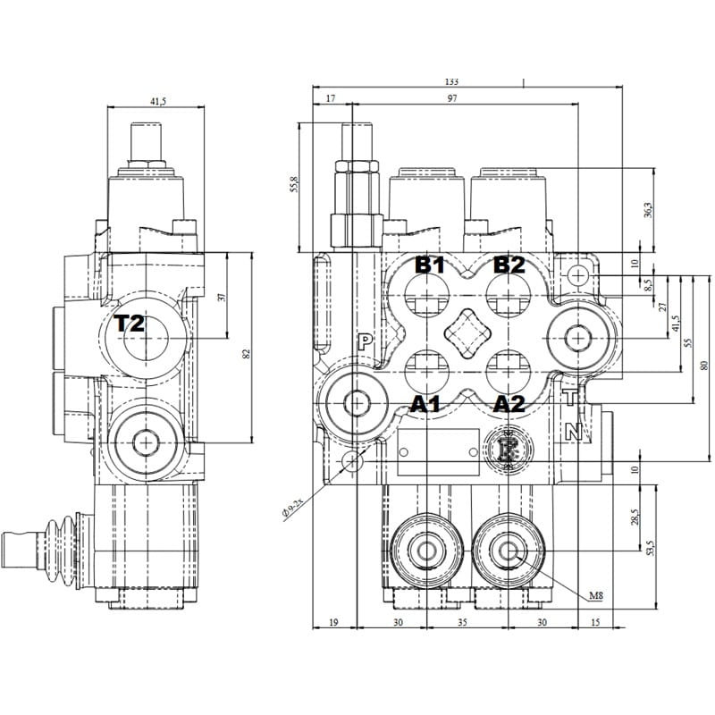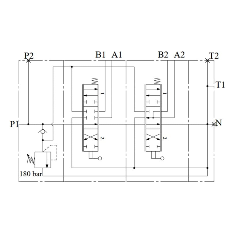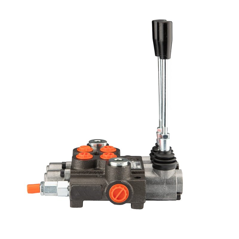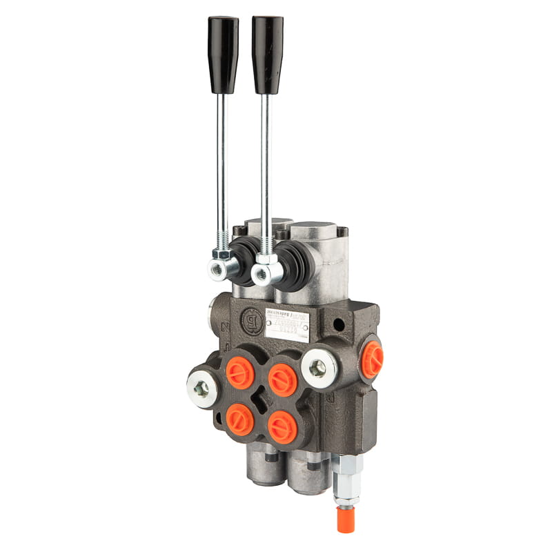 Maximální průtok až 40 l/min. První třípolohová páka (1 - 0 - 2) na pružině, která se automaticky vrací do polohy 0 (neutrální). V poloze 0 neutrální (páka nastavená svisle) je pístní tyč válce v klidu - olej proudí do přepadu. V poloze 1 (páka nastavená diagonálně dopředu) se pístní tyč válce vysouvá. V poloze 2 (páka nastavená diagonálně dozadu) se pístní tyč válce zasouvá. Druhá třípolohová páka (1 - 0 - 2) je na pružině, která se automaticky vrací do polohy 0 (neutrální). V poloze 0 neutrál (páka nastavená svisle) motor neběží - olej proudí do přepadu. V poloze 1 (páka nastavená diagonálně dopředu) se motor otáčí proti směru hodinových ručiček. V poloze 2 (páka nastavená diagonálně dozadu) se motor otáčí ve směru hodinových ručiček. Vnitřní závity v tělese: přívod: G1/2-14; návrat: G3/4-14; průřezy: G1/2-14