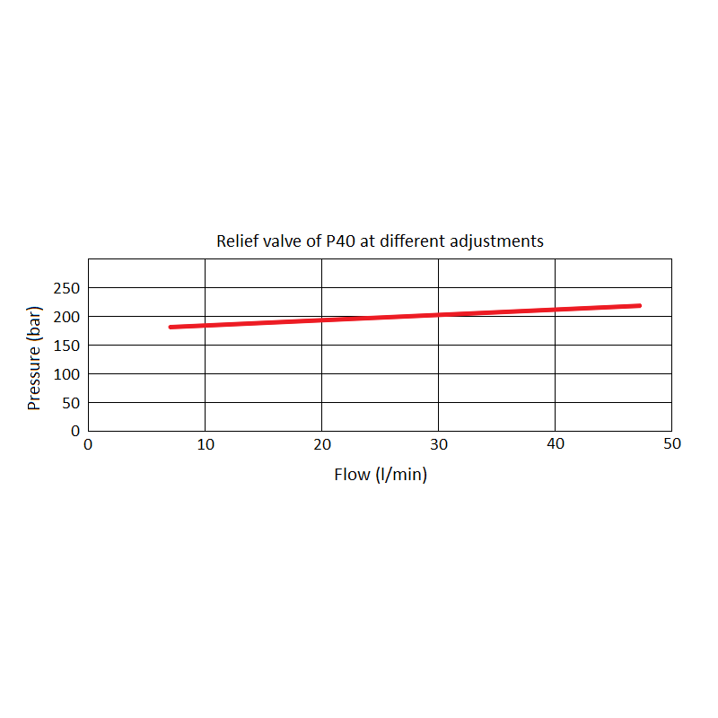 Počet sekcí: 2 Maximální průtok: 40L/min ----------------------------------------------------------------- Maximální pracovní tlak P - N: 250 bar Maximální pracovní tlak A - B: 300 bar Maximální pracovní tlak T: 50 bar Nastavení pojistného ventilu: Otevírací tlak přepouštěcího ventilu se zvyšuje úměrně s rostoucím průtokem: