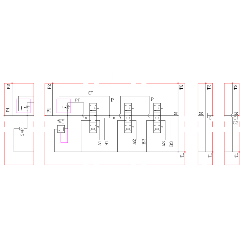 Hydraulický rozvaděč typu PF s ventilem P40 je vybaven vestavěným třícestným regulátorem průtoku s prioritní funkcí a kompenzací tlaku, umístěným na vstupu.