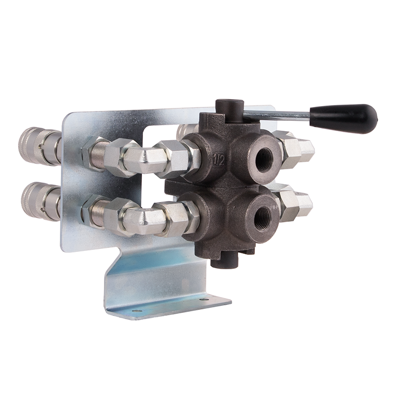 Kompletní rozdělovač s kulovým ventilem a rychlospojkami umožňující přepínání dvojitého přívodního vedení mezi dvěma páry výstupních vedení. Používá se k ovládání zemědělských a průmyslových strojů, kdy můžeme ovládat pouze jednu sekci a stroj má dva hydraulické přijímače, které nepracují současně. Perfektní pro přepínání výkonu mezi dvěma dvojčinnými válci nebo hydromotory pracujícími v jednom nebo dvou směrech. |
