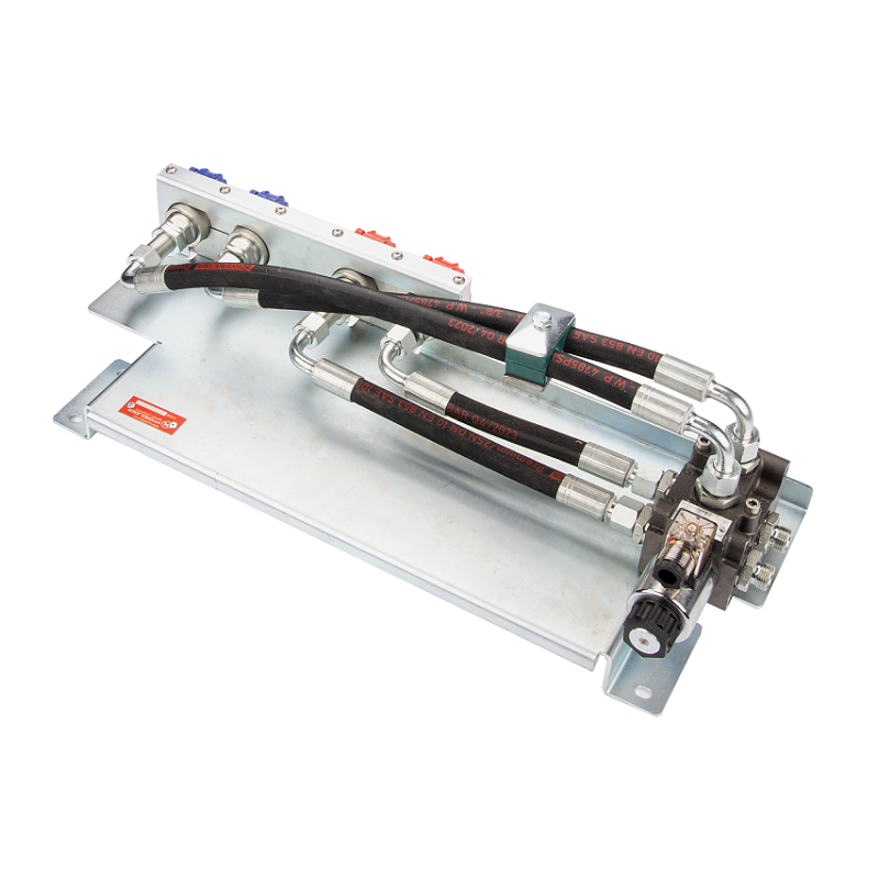 Kompletní 3. sekce pro čelní nakladač TUR. Sada je určena pro přední montáž na rám nakladače. Elektromagnetický ventil připojený k jedné sekci v hydraulickém rozvaděči umožňuje ovládání dvou sekcí. U čelního nakladače to může být přepínání mezi vyrovnáním rámu a otevíráním a zavíráním krokodýla. Přepínání ovládání mezi sekcemi je elektrické a provádí se pomocí tlačítka na panelu nebo joysticku. |