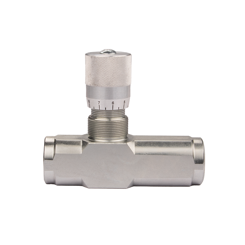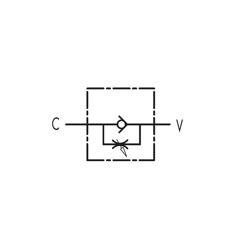 Škrtící ventil reguluje (škrtí) průtok v jednom směru, zatímco v druhém směru je průtok volný. Regulace průtoku závisí na tlaku oleje a jeho typu, provádí se pomocí knoflíku, nastavení lze zajistit aretačním šroubem |