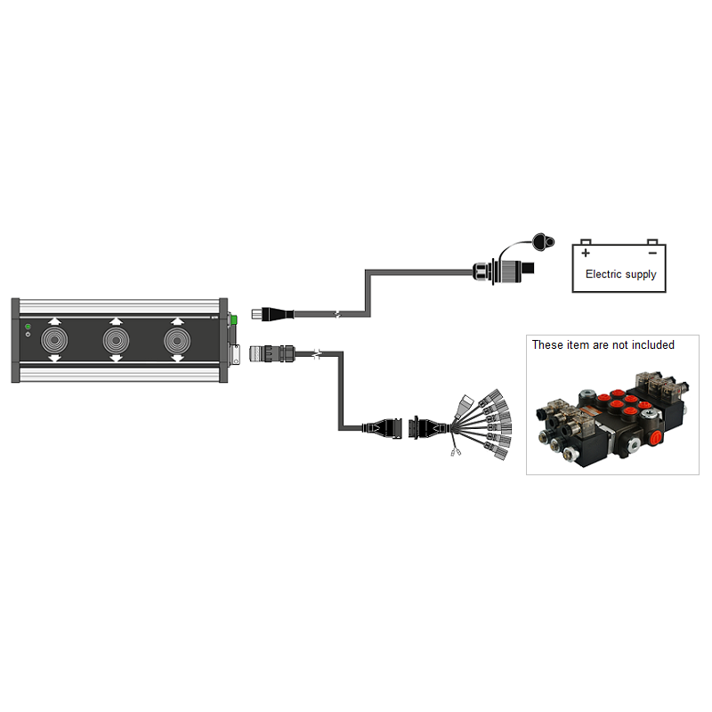Skříň se třemi manipulátory s 3-polohovými pákami umožňuje ovládat tři sekce v 12V elektricky ovládaném hydraulickém rozvaděči. Je široce používán v elektrickém ovládání hydraulických systémů v zemědělství, stavebnictví a průmyslu. Byt je kompletní a připravený k práci. Má všechny potřebné přípojky a elektrické výstupy. Vybaveno třemi joysticky, bezpečnostním spínačem, dvěma napájecími zásuvkami, výstupem rozdělovače a veškerou potřebnou elektronikou a pojistkami. Včetně dalšího příslušenství: napájecí kabel, zásuvka a montážní držák. Kabely a zástrčky pro připojení k rozbočovači je nutné zakoupit samostatně. Každý joystick má 2 nestabilní (pracovní) polohy a jednu stabilní (neutrální středová poloha). Monostabilní konstrukce, kdy se páka joysticku sama vrací do střední - neutrální polohy. Mají pryžový těsnící kryt pro ochranu proti prachu, vodě a oleji. |