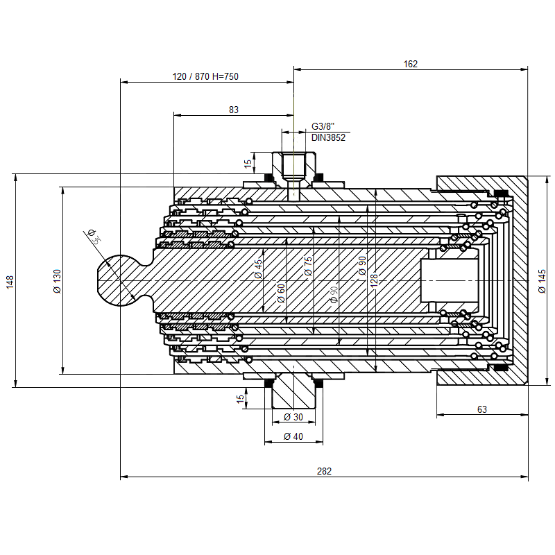 Teleskopický hydraulický válec 105/5/750 zdvih 750 mm s objímkou