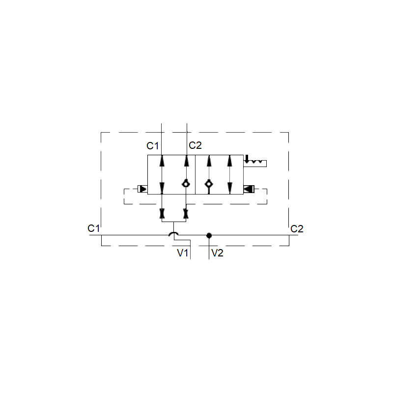 Připojte V1 a V2 k elektrickému vedení, např. do zásuvek v traktoru nebo dvou portů A a B v sekci rozdělovače. Připojte jednu stranu A a B z ventilu k portům C2 na dvojčinných pohonech. Připojte druhou stranu A a B z ventilu k portům C1 na pohonech. |